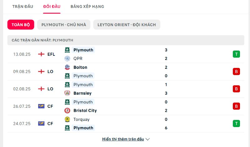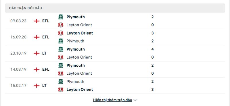 Thành tích đối đầu giữa Plymouth vs Leyton Orient